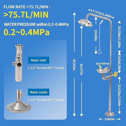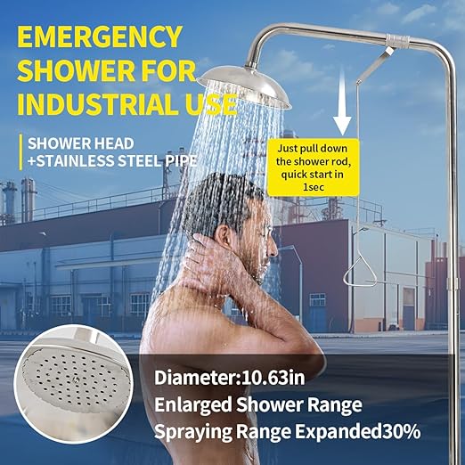 Acero inoxidable: El cuerpo principal está hecho de acero inoxidable 304 de grado industrial, no es fácil de romper o agrietar, pero fácil de limpiar. Adecuado para ducha de emergencia al aire libre o interior. La interfaz de rosca estándar NPT de 1/2 pulgada se conecta perfectamente a la tubería existente, con un sellado fuerte para evitar riesgos de fugas de agua