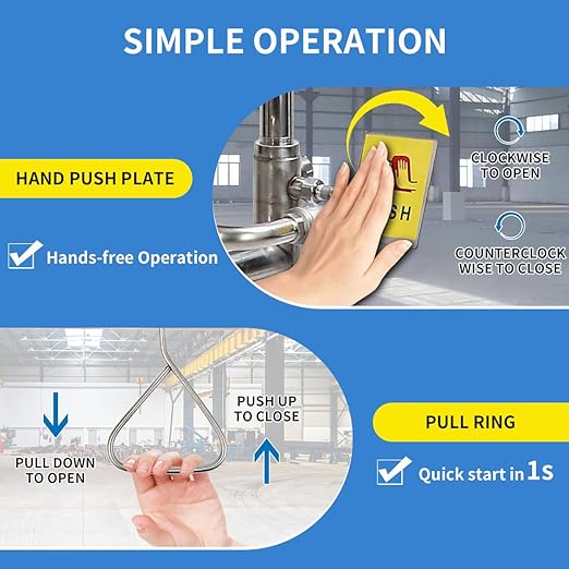 Funcionamiento conveniente: esta estación de ducha se controla con un llamativo letrero de emergencia amarillo. El anillo de tracción controla el interruptor de ducha de emergencia, tira hacia abajo para abrir, empuja hacia arriba para cerrar. La placa de empuje manual controla el interruptor de la boquilla del lavaojos, en el sentido de las agujas del reloj para abrir, en sentido antihorario para cerrar. Fácil de usar. Inicio rápido en 1 seg