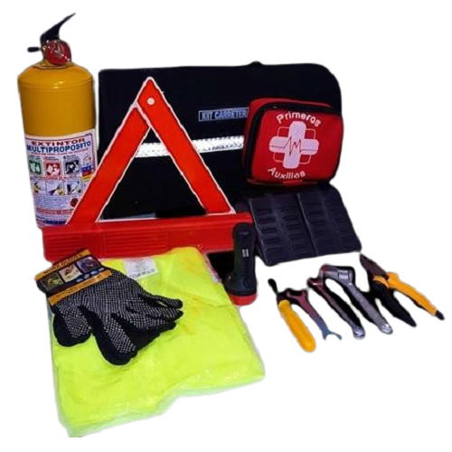 Extintor vigente, dos tacos de bloqueo, dos señales reflectivas, botiquín de primeros auxilios, linterna, y caja de herramientas (alicates, destornilladores, llave de expansión y llaves fijas)