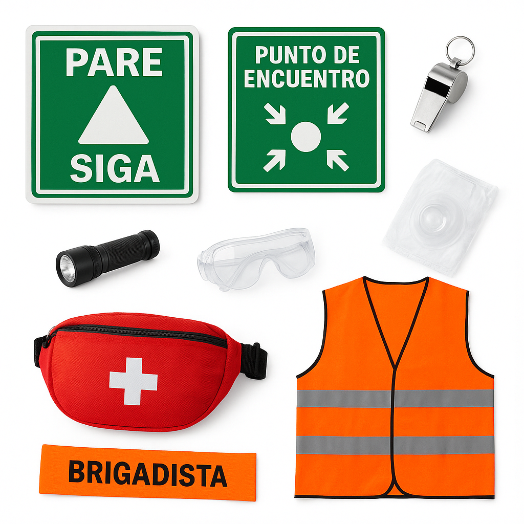 Kit para brigadista incluye elementos esenciales de protección personal como gafas y chaleco reflectivo, además de herramientas de primeros auxilios y comunicación como botiquín, linterna y silbato.